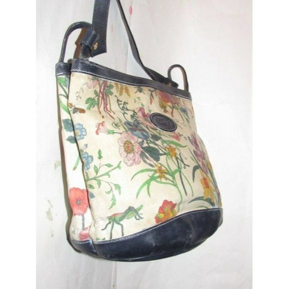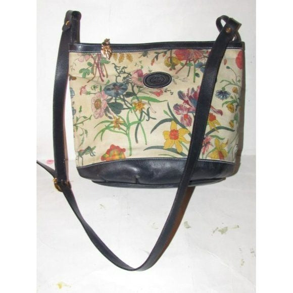 For sale is a vintage, AMAZING, Gucci, floral design canvas and navy blue leather, multiple compartment, snap top, XL satchel style, hobo, cross body or shoulder bag! This is a perfect, rare, vintage print by Gucci, XL purse that will never go out of style! The bag is made of floral print canvas and navy blue leather. The floral print canvas has multi-colored flowers and butterflies. It is a snap top bucket shaped cross body style with lots of room. All measurements are approximate. N0425