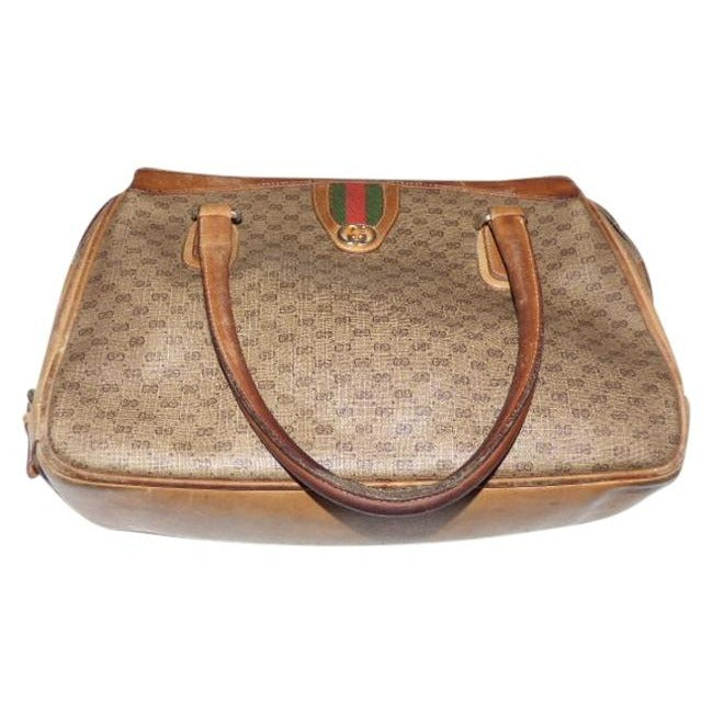 For sale is a vintage, GUCCI, brown small 'G' logo coated canvas and leather, two handle, large, satchel/speedy bag with a red and green striped accent and a wrap around zipper that buckles into place! This bag is a great example of an early Gucci satchel at its best!