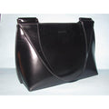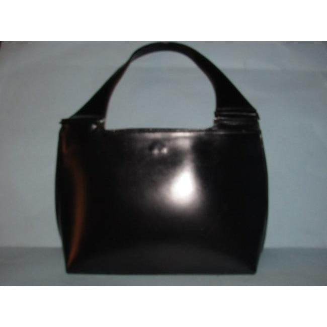 The bag made of leather in a black that is glossy, almost patent leather. It has a shorter, hard leather shoulder strap and is a unique, structured, boxy, rectangular shape! Inside there is one compartment and a zip pockets. The expandable sides allows it to hold quite a bit! It is a 1960's mod style piece that will always be in style!