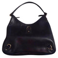 The bag is a large, hobo style purse with a top zip and single shoulder strap. It has one interior compartment with smaller, interior pockets. This purse is called an 'Abbey large D ring' style! The purse is made of navy blue, textured, supple leather with gold accents throughout, including three D- shaped rings engraved with 'Gucci'.