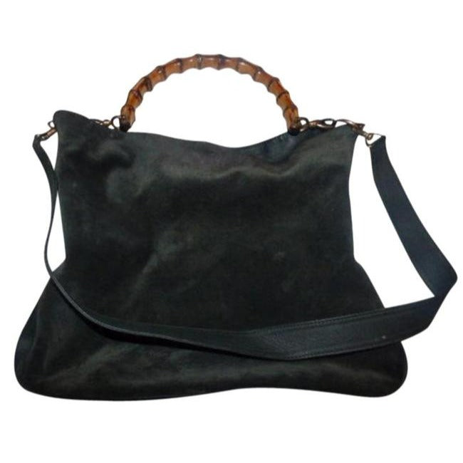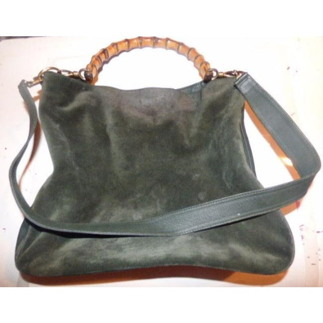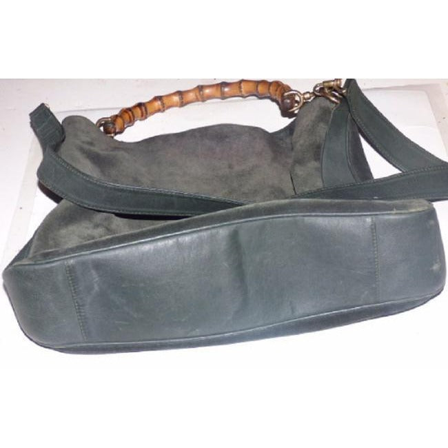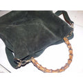 For sale is a Gucci, mod look, extra large, dark green suede/leather, two-way, purse with detachable strap, bamboo handle & gold equestrian accents! It has the 1960's classic mod style Gucci is known for and would be great used as your fun, green purse!