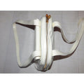 The bag is a top dual zip, shoulder style purse with two longer straps. It has one interior compartment with an interior zip pocket. This purse is designed in such a classic style! The purse has the large, embossed double 'Gucci' printed in the center of the front on an exterior pocket. The purse is ivory patent leather.