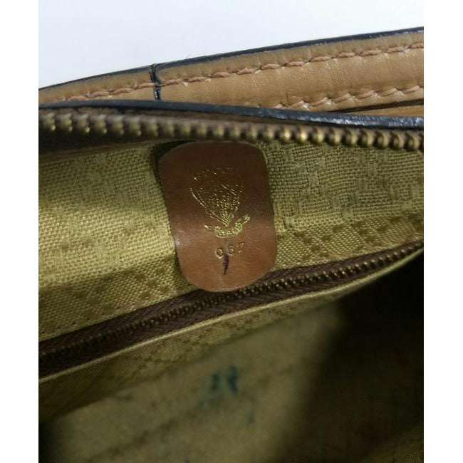 It is from, I think, the 1960's/1970's and by Gucci. The purse predate serial #s the way we think of them now, but has an oval leather tag with a gold embossed crest and writing that reads 'Gucci' and 'Italy'with the number '087'. The purse has been authenticated by a third party source, so buy with confidence! I have the identical style in burgundy, brown, and black with small G logo print fabric.
