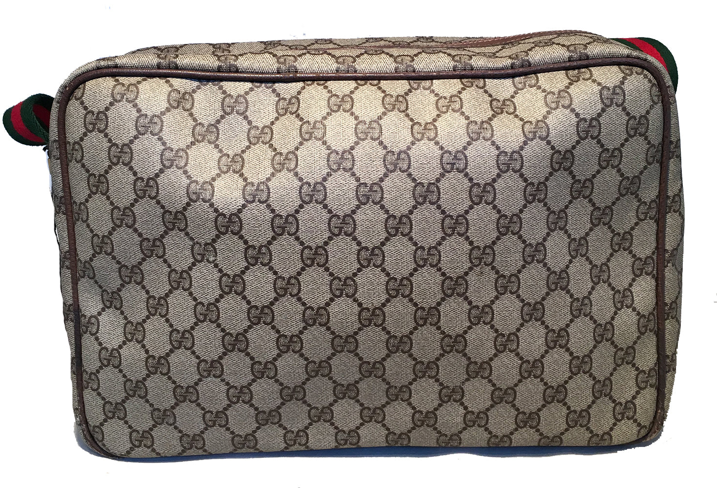 Gucci Vintage Monogram Customized Hand Painted Ladybug Reporter Messenger Shoulder Bag in very good condition. Gucci monogram canvas exterior trimmed with light brown leather, gold hardware, and signature green and red striped woven canvas shoulder strap. Customized, hand painted ladybugs on greenery along front by our in-house artisan. Front zippered pouch pocket. Top zipper closure opens to a canvas interior that has plenty of storage space for all your essentials and more. no exterior stains or smells. light wear throughout consistent with age and use. Light water stains on interior lining. Scuffs and wear on exterior bottom corners, see photos for details. Measurements: 13.5"x9"x4" 17.5" strap drop