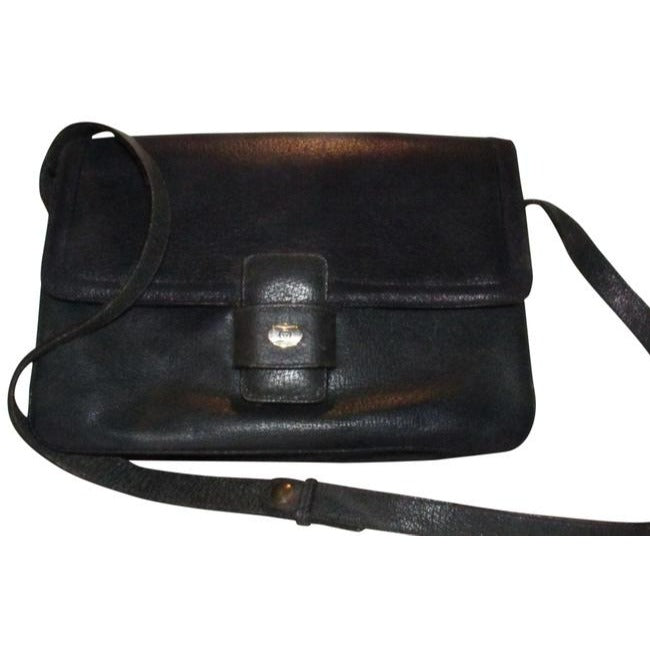 The bag has a deep midnight blue leather body. It has bold gold tone accents at the front, center clasp and sides where the strap is attached! It has a doubled shoulder strap with an envelope flap top and the strap is two leather straps-it may have once had two settings, but now it there is