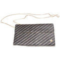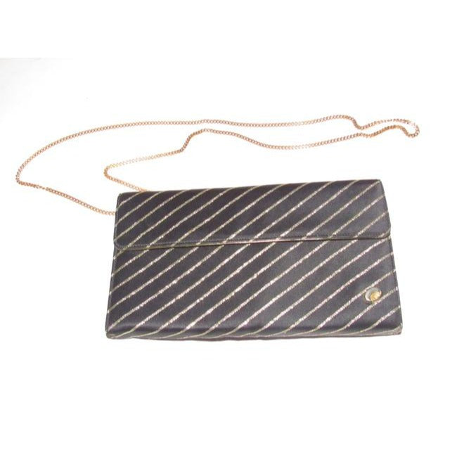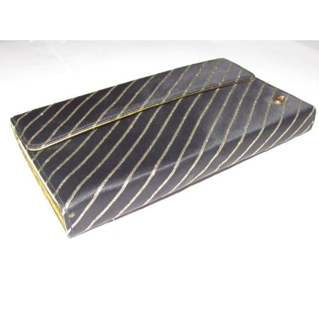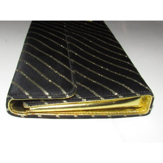 For sale is an early, unique, Gucci, black silk and gold leather, envelope top, two way- handheld clutch or shoulder bag with three compartments, a removable gold chain strap, and metallic gold stripes! It is a unique take on a classic evening bag style that would be great used as your purse for dressier occasions!
