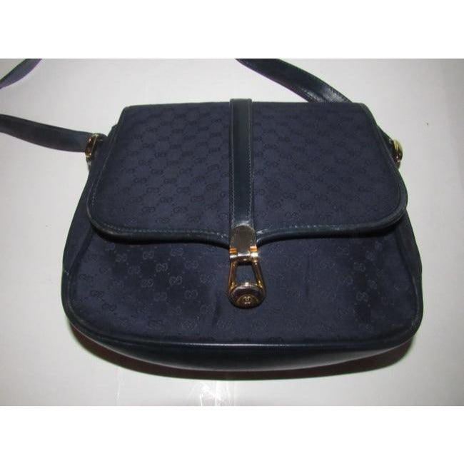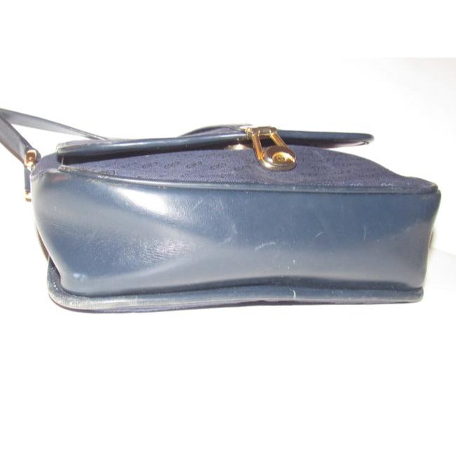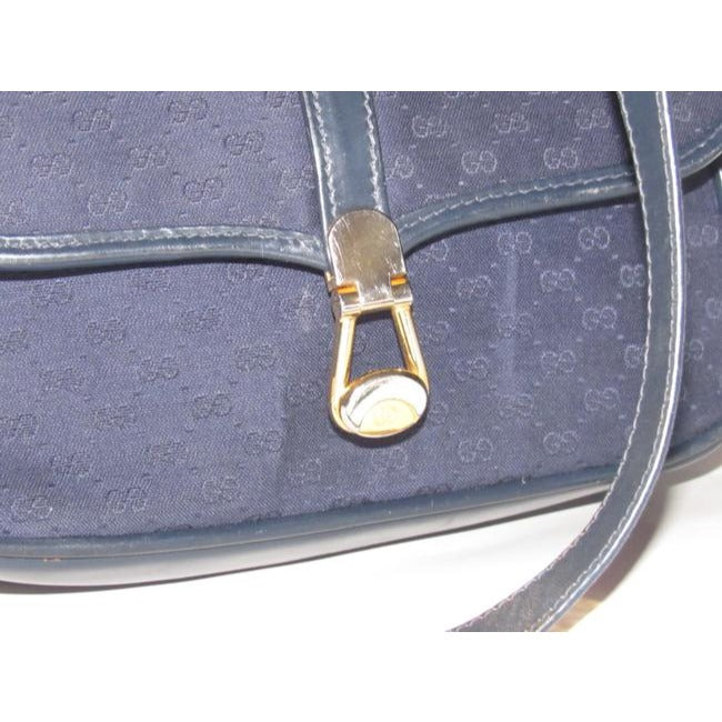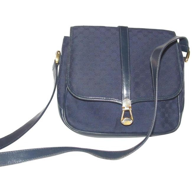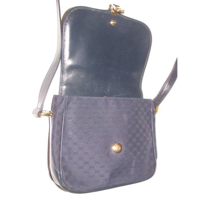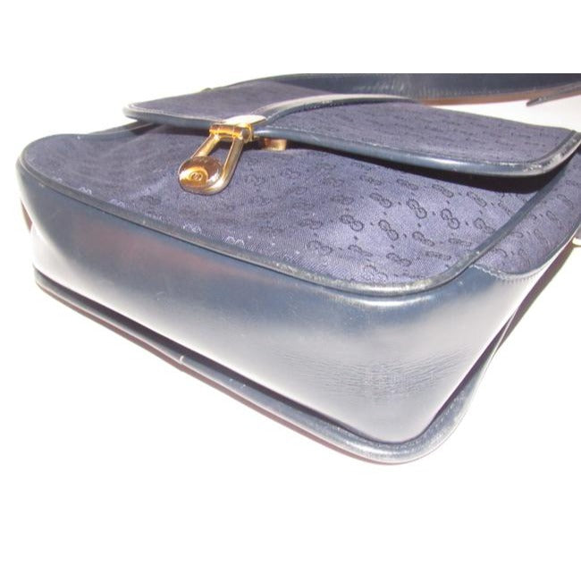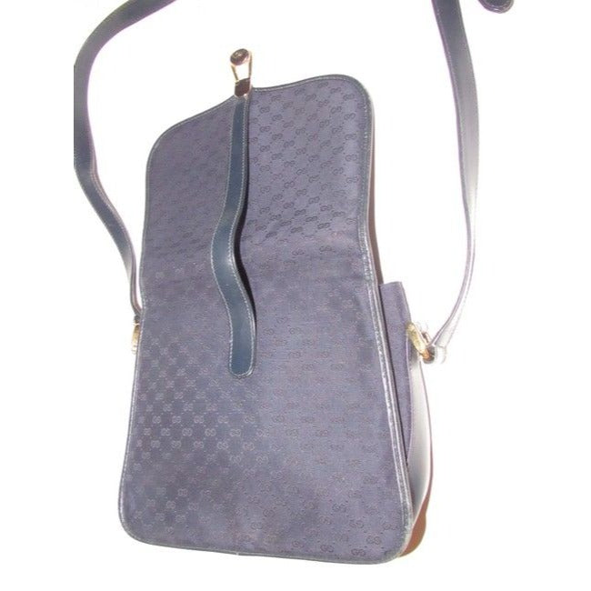 For sale is a RARE, Gucci, navy small G logo print canvas and navy leather, saddle bag style top, shoulder purse with an adjustable strap and saddle bag style, front flap with a bold gold, magnetic snap closure at the bottom with the 'GG' logo engraved in a unique triangular, door knocker style! This is a rare, early style, purse from Gucci that will be the only navy blue purse you will need!