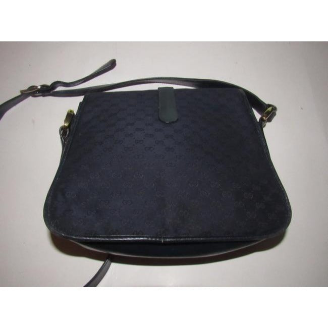 The bag is made of a navy small G logo print canvas and navy leather. It has gold tone accents at the front, bottom, 'GG' door knocker snap clasp and the buckles that the strap attaches to on both sides. The strap can be adjusted. This is an adorable early Gucci saddle bag style purse!
