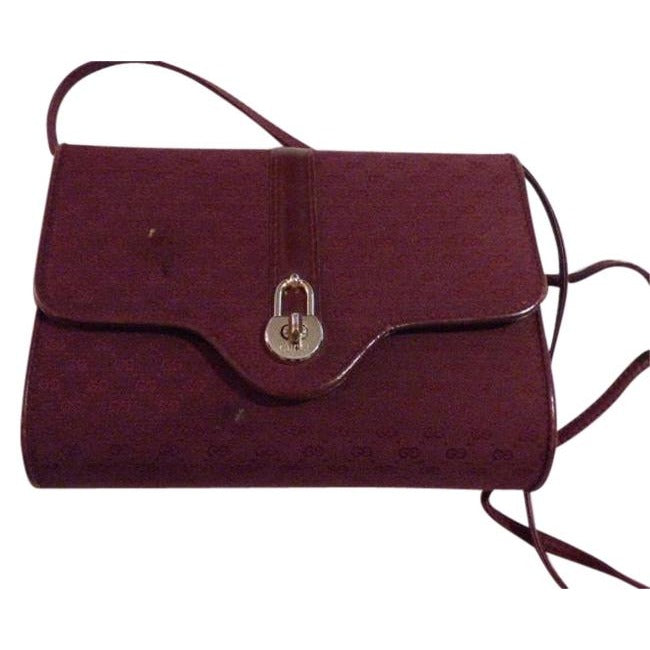 The bag is a cross body, clutch, or shoulder style purse by GUCCI in a rare, burgundy, small G logo print fabric and leather style. It is made from ox blood red/ burgundy fabric with the small G logo design and leather with gold tone hardware. It has an envelope top and twist lock closure shaped like a padlock accent. The thin leather strap could easily be tucked in the purse to make it a clutch! It is lined with a light beige leather interior that looks unused! It has a back zip and front slot pocket to keep you organized and is very clean.