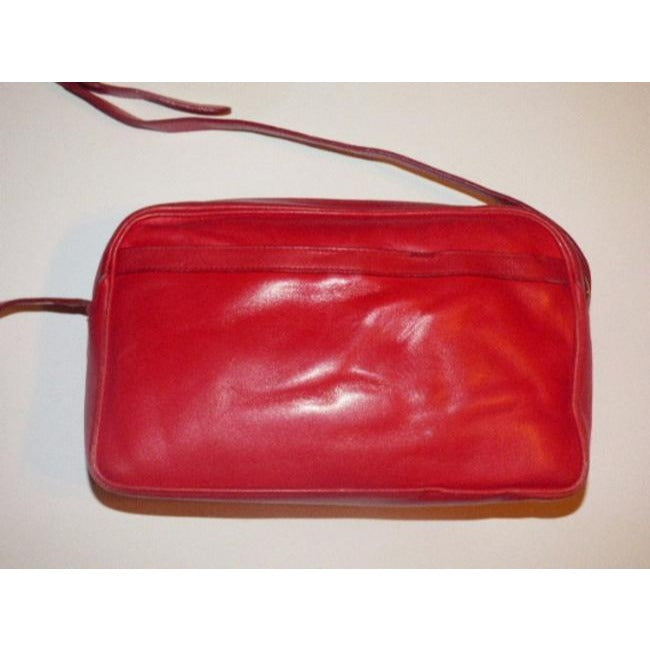 The bag is a rectangular, top zip, cross body or shoulder style purse that was a classic shape and design for Gucci in the 1980's. It has one, large interior compartment with a zip pocket. The purse is made of buttery soft leather in a true red. There are exterior pockets on both sides and the strap is adjustable in length.