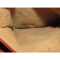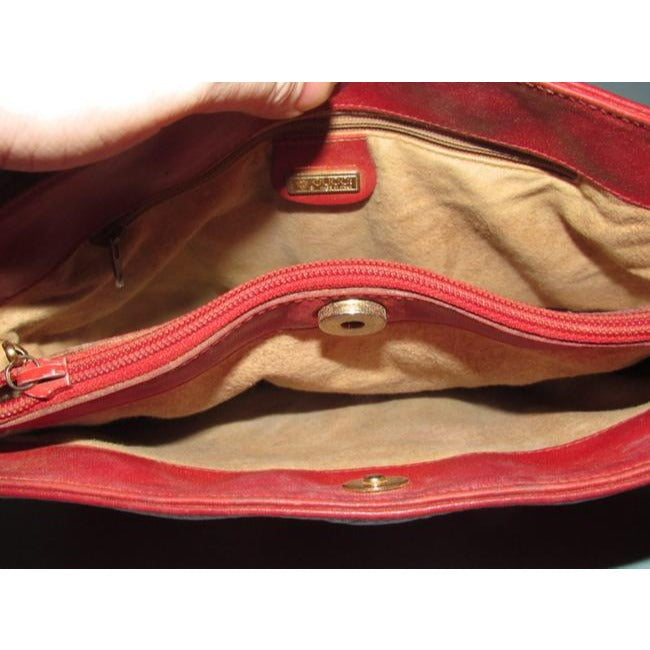 The bag is the perfect roomy bag by Gucci that is in a great pop of color! The exterior is a brown red small G logo coated canvas and leather with gold hardware. The purse has 3 compartments and the two on either side of the center zip compartment snap to it at the top to close. The purse is a large size and can hold quite a bit because of the compartments and wide bottom!!