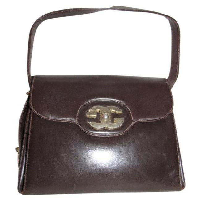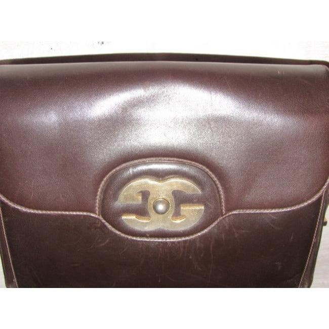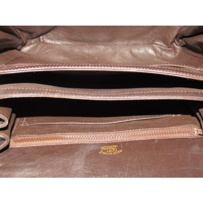 The bag is the perfect top handle, early satchel satchel shoulder purse by Gucci that no one else will have! The purse is made of buttery soft, rich brown leather with bold gold tone accents! It is a larger size and has an envelope style flap top and snap closure with a 'GG' shape. It has a true 1960's Gucci mod look! It has a pocket on the back of the exterior, too.
