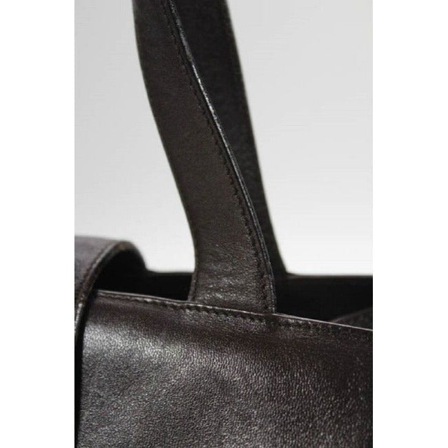 The bag is a handheld, satchel or tote style bag made with a supple dark brown leather! It has two leather handles and a roomy interior. It has a bold, gold square 'G' logo accent that is attached to the leather strap that is attached to the body of the purse and snaps on the front to secure it. The purse has a structured frame and is very roomy, really unusual, and gorgeous!
