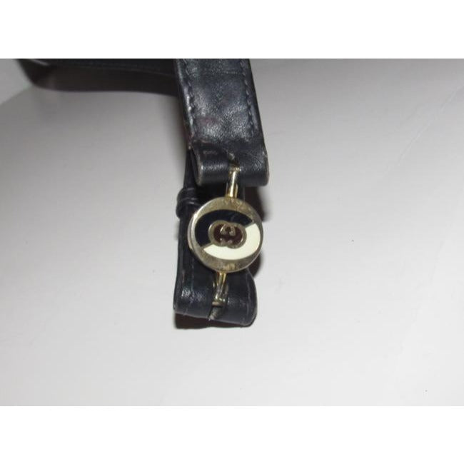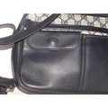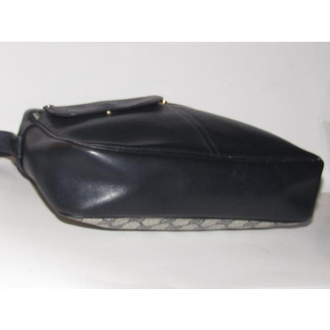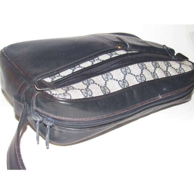 This is a gorgeous, rare piece from Gucci that has been some one took extremely good care! This is a fabulous bag by Gucci! The bag is made with the navy blue large 'G' logo print coated canvas and navy blue leather. The top of the purse is a zip closure and the front has two front leather pockets and a zip pocket in the coated canvas. One leather pocket has a flap closure and the other has an open top. It has an adjustable leather strap with a gorgeous blue/white enamel GG logo accent on the strap. It has the leather framing the purse and as the strap and their connectors, bottom, base corners, piping, the adjustable strap, and top.