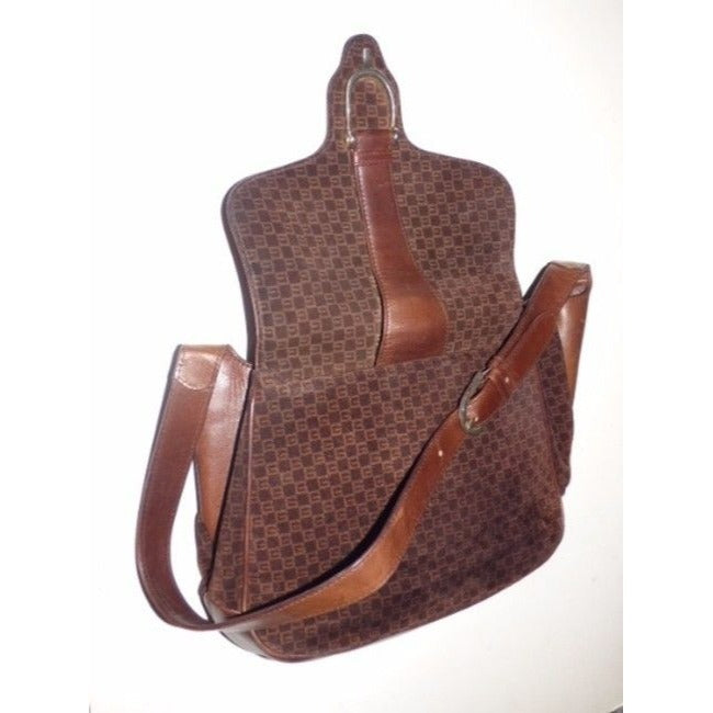 The bag is unusual- not like the classic, Gucci, purses I see on here for sale. The purse is brown suede with brown leather. The suede has a small G logo print with a more squared G. The top is an envelope top style and it has a snap closure that was replaced (they become de-magnetized over time). It has one wide strap with gold hardware and a large horse- bit, equestrian accent at the center! The purse is a perfect everyday purse! There is an exterior pocket at the back.