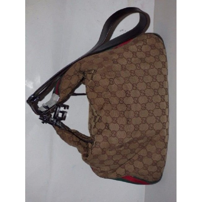 This is one of those pieces that looks much cuter in person than in pictures. The bag is the perfect hobo by Gucci that everyone wants in this color combination! The exterior is brown fabric with the large G logo design and brown leather. The purse is a large size and has a wide red and green stripe that outlines the entire purse! It has bold chrome hardware and a unique 'G' latch top accent that gives the purse a whole different, pouch or sack shape when it is clasped!