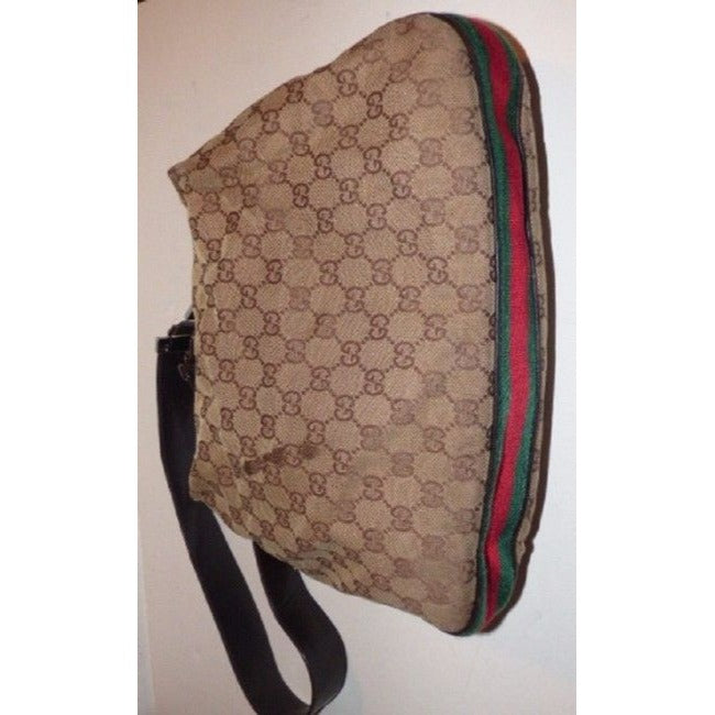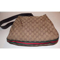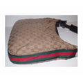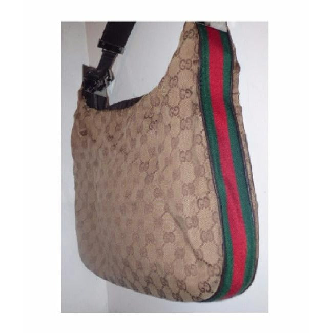 For sale is a Gucci, brown large logo fabric/leather, large size, hobo style bag with red/green stripe, G latch top & chrome hardware! It is a unique take on a classic style from Gucci that would be great used as your signature purse!