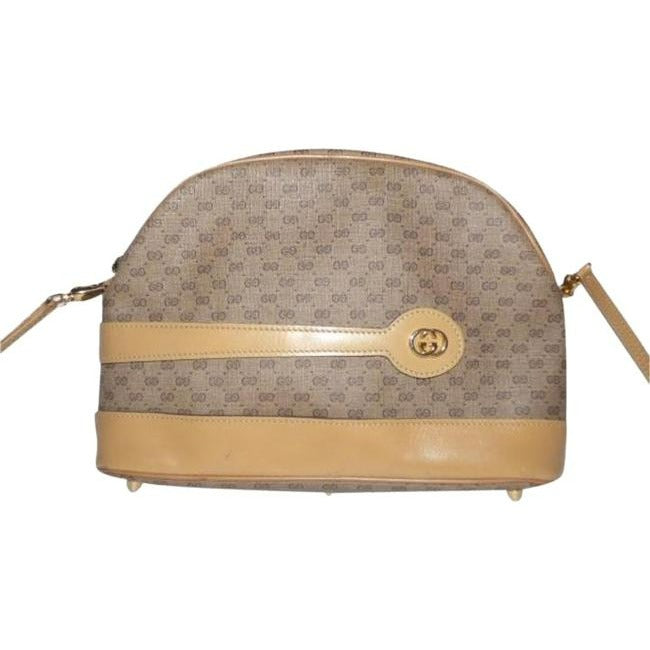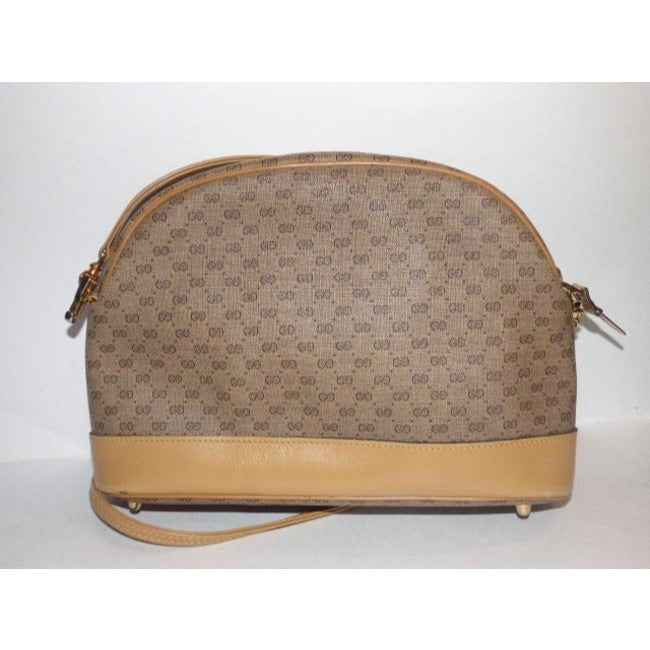 For sale is a vintage, Gucci, unique, RARE, camel leather & brown small logo, coated canvas, top zip, hobo style, cross body/shoulder purse with a rounded top, footed bottom, and removable strap! This is the only brown purse you will ever need!