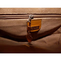 The bag has minimal wear to the leather lining. It has a kiss closure with a keyhole cutout and three compartments, including a zip closure on the interior.