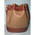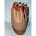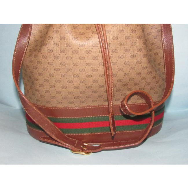 For sale is a Gucci, dark brown small G logo print on a lighter brown coated canvas and brown leather, XL, drawstring top, bucket shaped satchel style shoulder bag with a red and green stripe at the bottom! It is a perfect, everyday purse that will never go out of style!