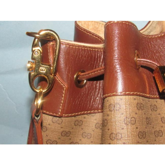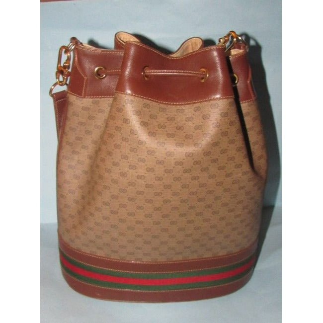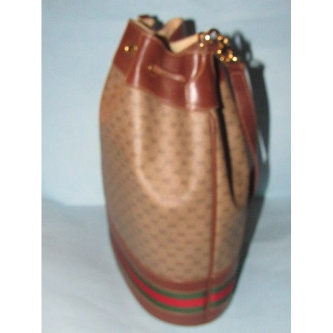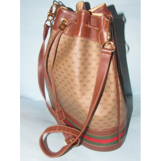 This Gucci drawstring top bucket purse is probably from the 1980's/90's, but in the new Gucci collection, many of these vintage logo print drawstring top bucket bags were re-released! The bag is made of a dark brown small G logo print on a lighter brown coated canvas and brown leather and has a red and green fabric stripe that goes all the way around the base. It is a drawstring top bucket / shoulder style with lots of room and a removable or adjustable strap. It has leather accents at the top, strap, sides, drawstring and piping and gold engraved hardware. This is a perfect signature purse.