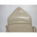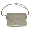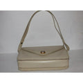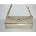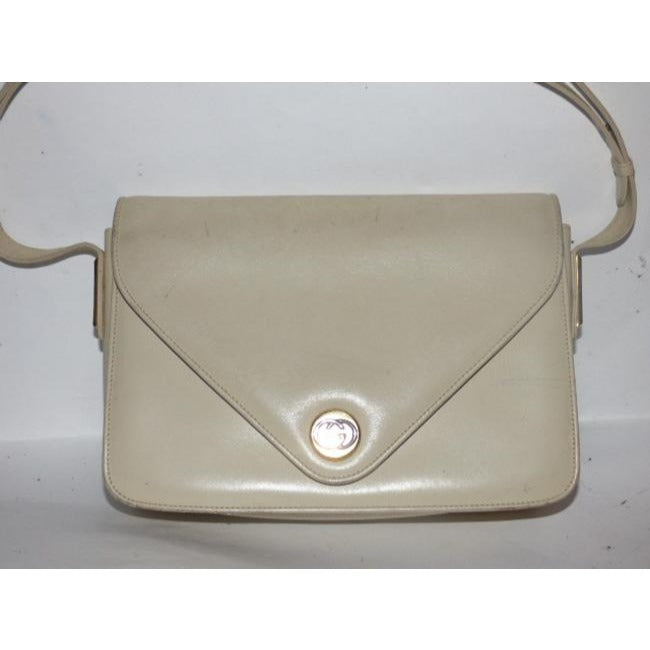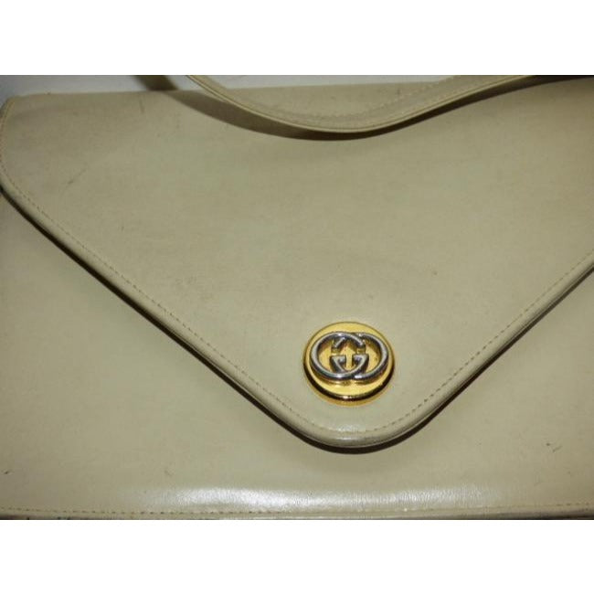 The bag is the perfect envelope shoulder bag style purse by early Gucci! The purse is a medium size and has two lengths the strap can be snapped into! It is made of a smooth ivory or stone colored leather with an envelope top, snap closure. There is a two-tone GG accents that is attached to the front of the snap closure. It has the true 1960's Gucci mod look that is always in style!