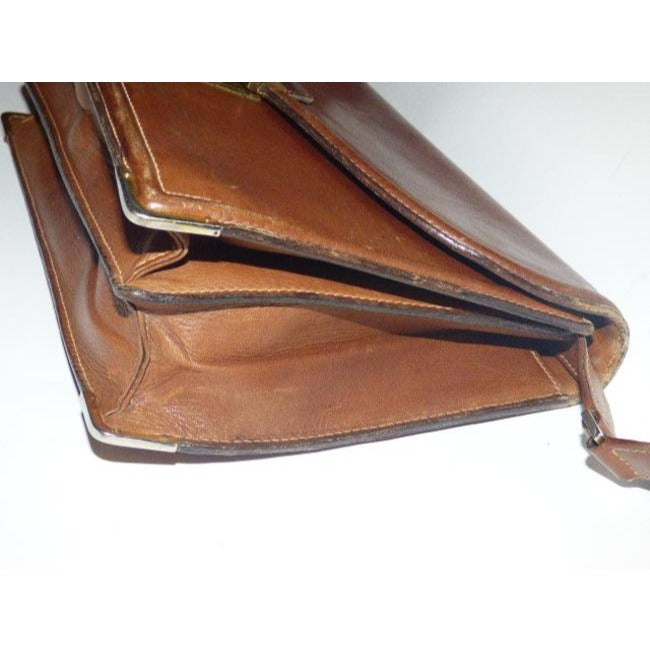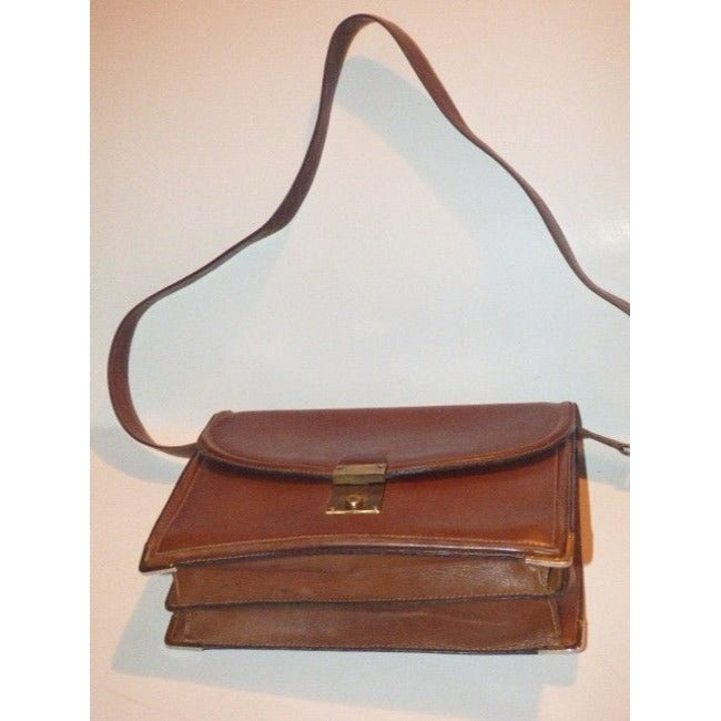 The bag made of leather in a medium shade of brown. It has a removable shoulder strap and is a classic, rectangular shape with multiple compartments inside that allow it to hold quite a bit! It has an unusual, locking slide clasp and is a 1960's mod style piece that will always be in style!
