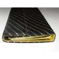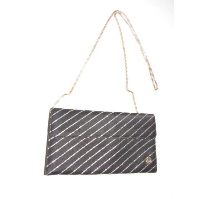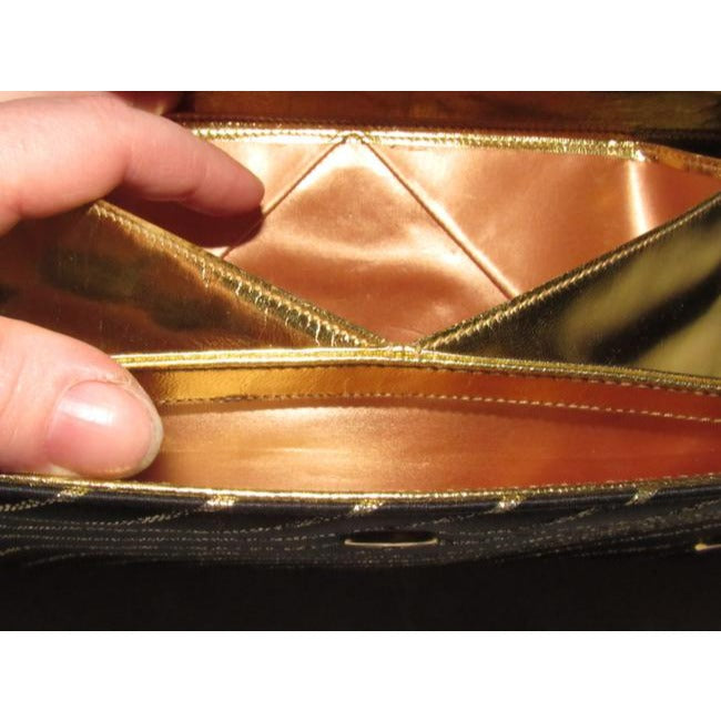 The bag is a dressier, petite, two way- clutch or shoulder style purse with a removable gold chain strap. It is made of black silk with gold metallic stripes throughout. Inside, it opens up to reveal a gold leather lining with three compartments and two pockets that fold into itself to be as compact or full as you need! This purse is designed in such a smart, unique, and unusual style! It is like you are getting two purses for the price of one!