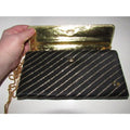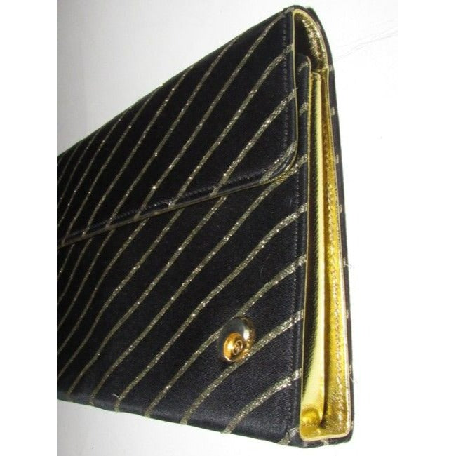 For sale is an early, unique, Gucci, black silk and gold leather, envelope top, two way- handheld clutch or shoulder bag with three compartments, a removable gold chain strap, and metallic gold stripes! It is a unique take on a classic evening bag style that would be great used as your purse for dressier occasions!