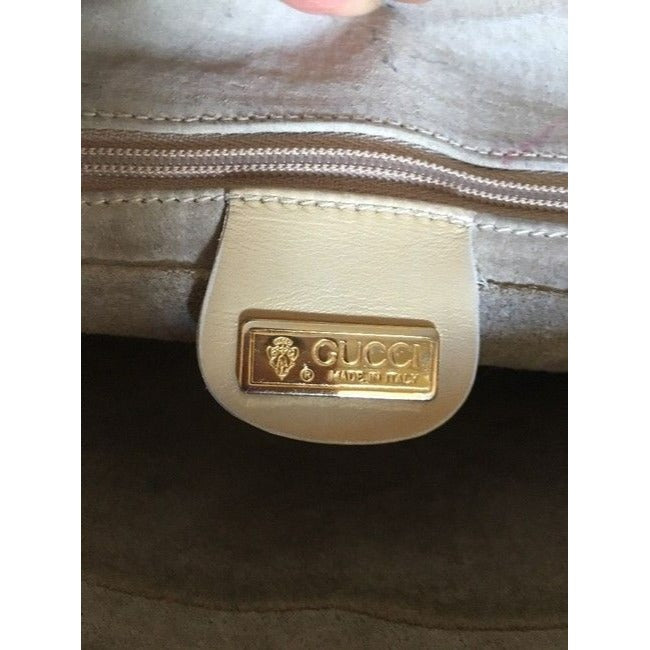 The bag has a camel textured leather body and strap. It has an adjustable shoulder strap and is a classic, half moon shape with a zip top. It has white leather framing the top of the purse. The interior is very clean! It is from, I think, the late 1970's and by Gucci. It has an authentication # of 001-58-0918. It has all of the details an authentic Gucci should, like the YKK zipper, the 'R' in a copyright style circle, gold tone fobs, & the Gucci/Italy/GG stamp on the hardware, so buy with confidence!