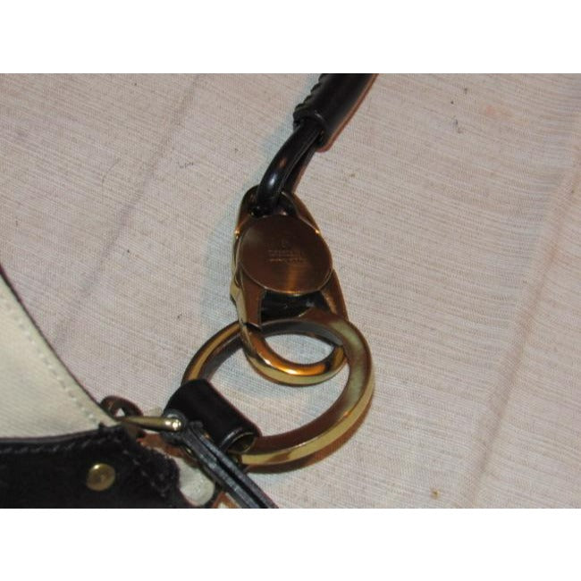 For sale is a Gucci, solid white canvas & black leather, extra large, hobo style purse with a heavy, black leather braided strap with bold gold accents, a removable strap, long leather zip pull, and attached black leather wallet! It is a classic style that would be great used as a purse for everyday or as your go to light neutral bag!