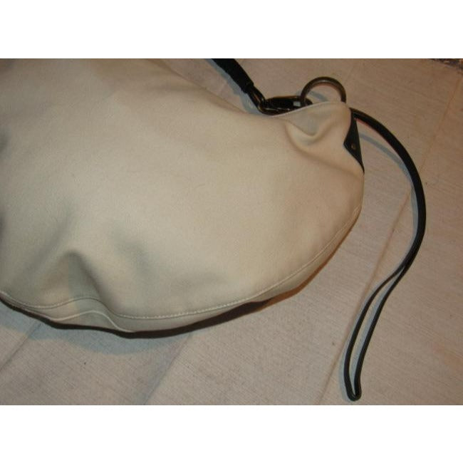 The bag is a large, hobo style purse. The purse is solid white heavy canvas and black leather and the hardware is bold gold tone. The strap is heavy braided back leather giving it a more bohemian look. There is an attached black leather wallet/change purse, too! It is not lined and has one big interior compartment with the attached wallet!