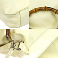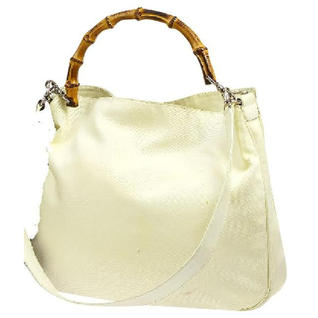 I believe this style is called the 'Sarah Flip-Top'. The bag is unusual- not like the classic, Gucci, purses I see online for sale in this style with horrible linings. The purse is a two-way, white patent leather and canvas with a bamboo handle and detachable patent leather strap. It has a top snap closure, it is the largest size, and has chrome hardware.