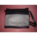 The bag is a large, cylindrical, tote style purse that reminds me of a camera bag. It has one, large interior compartment with a zip pocket. The purse has the small, double 'G' design in navy blue. The strap, top, bottom and other accents are navy blue leather and the strap is adjustable in length.