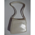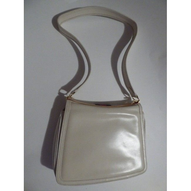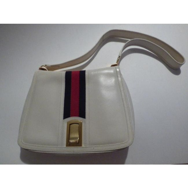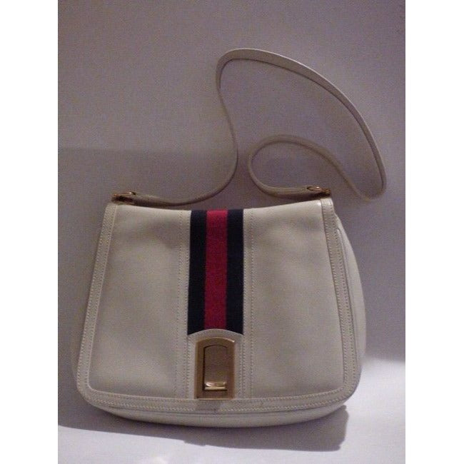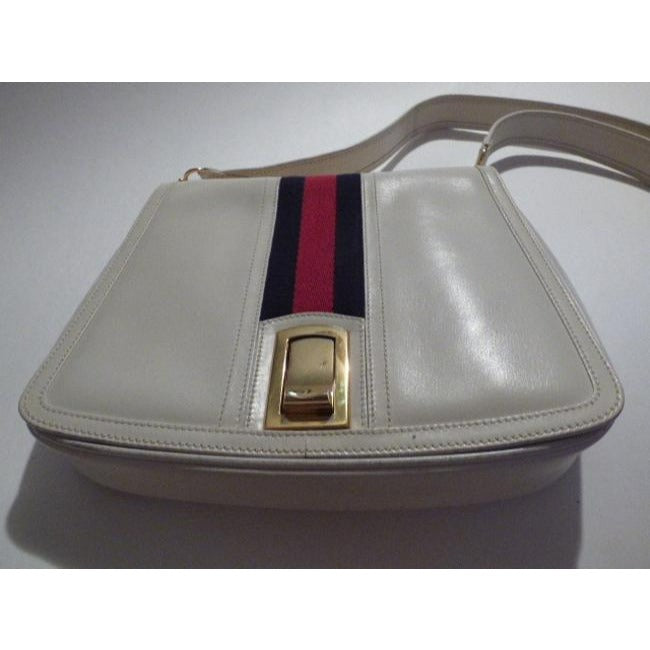 The bag is made of a solid, white leather body in amazing vintage condition and highly polished gold accents! It has a shoulder strap and is a classic, rectangular shape with an envelope flap top in a saddle bag style. In the center, it has a wide red and blue fabric accent stripes! There is a gold bar at the top and as the clasp!