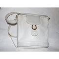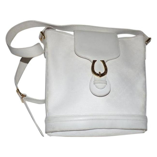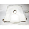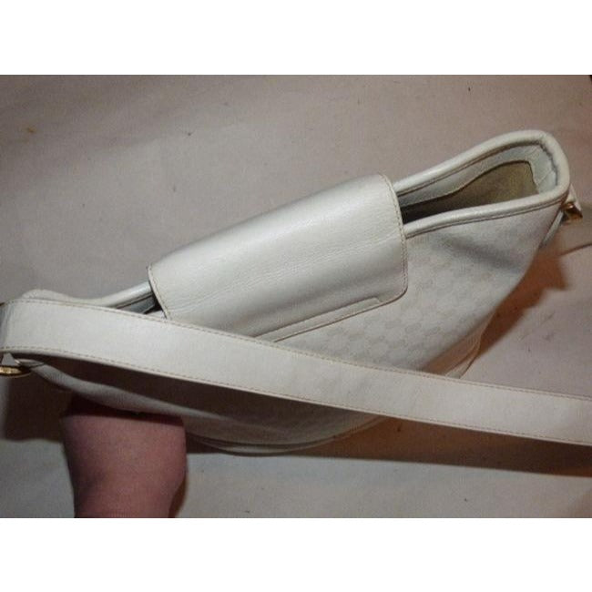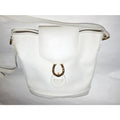 For sale is a RARE, Gucci, white coated canvas with the micro Guccissima print and white leather, satchel style bucket bag with large, gold equestrian accent at snap, a gold GUCCI engraved horseshoe, and a long, leather strap! It is a rare style that is the only white purse you will need! It would be great used as your signature style purse!