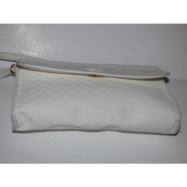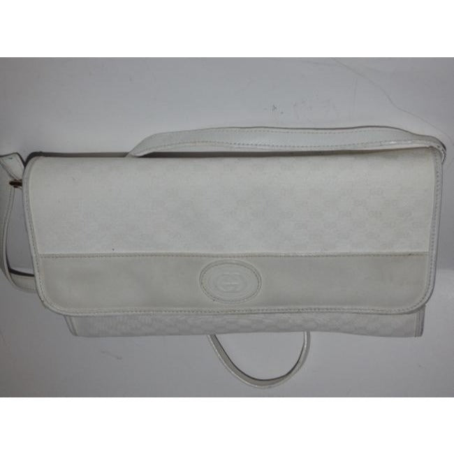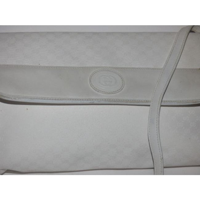 This is a fabulous, rare, GUCCI, leather, classic cross body purse/ shoulder bag has a removable strap too become a clutch! It is made of the Gucci small logo print coated canvas with white leather throughout. It has a classic, envelope, fold over front that snaps shut and zip close, back pocket.