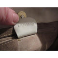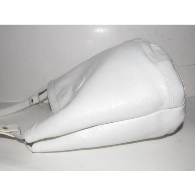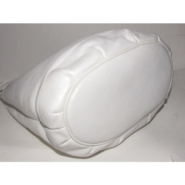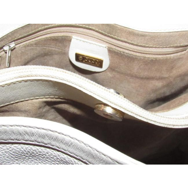 The bag is the perfect roomy bag by Gucci for warmer weather! The exterior is a white, textured leather with smooth leather trim and gold hardware. The purse has 3 compartments and the two on either side of the center zip compartment snap to it at the top to close. The purse is a large size and can hold quite a bit because of the compartments and wide bottom!
