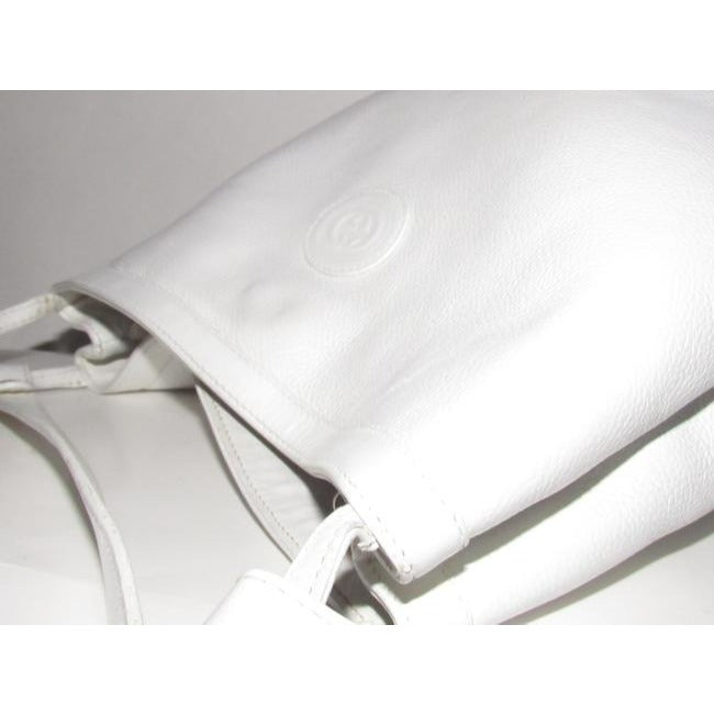 For sale is a vintage, Gucci, white textured leather, ex-large size, bucket style, cross body or shoulder bag with multiple interior compartments! It is a unique take on a classic bucket style from Gucci that would be great used as your signature white purse!