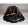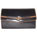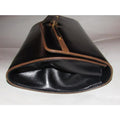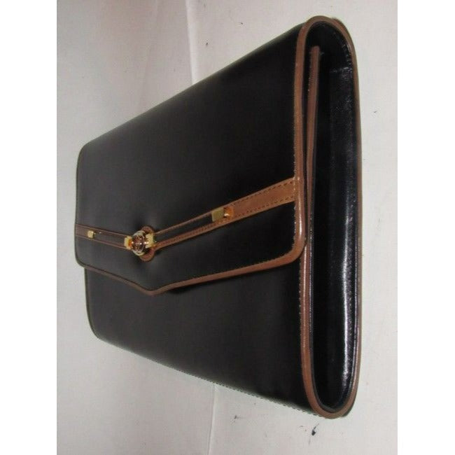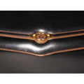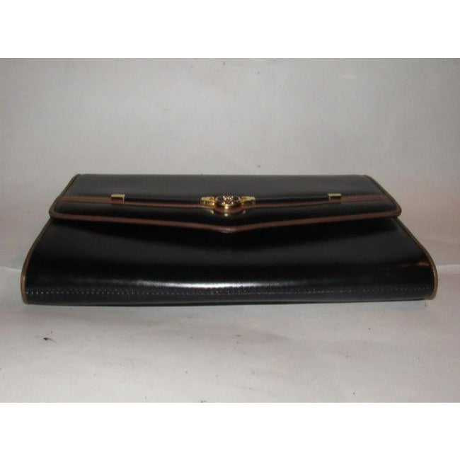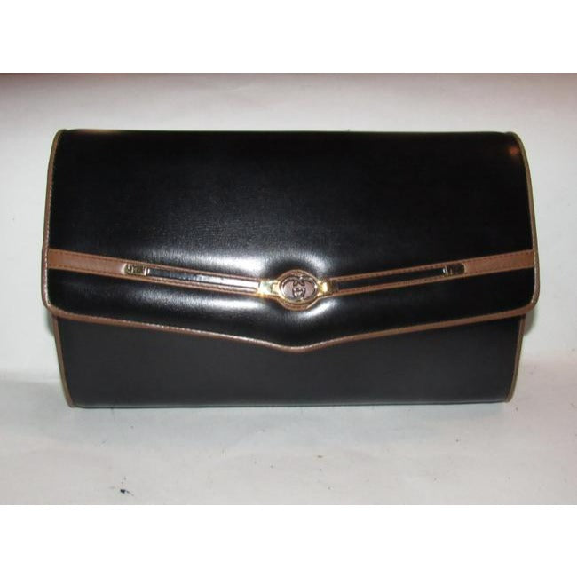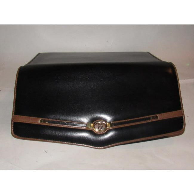 For sale is a Gucci, 1960's mod, glossy black leather with brown leather trim, envelope top, expandable, two-way style shoulder bag or clutch with gold, equestrian, horse bit accents at the front, a removable strap, and two tone GG logo accent at the center! It is an early style by Gucci that would be great used as a signature, everyday black purse or for dressier occasions!
