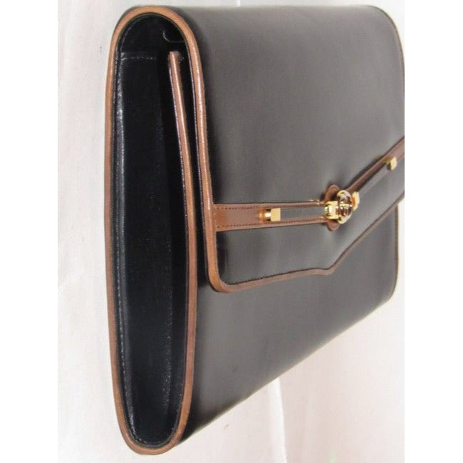 The bag is a larger, envelope top, shoulder purse with a removable strap to become a clutch! The body is made of rich glossy black leather with dark brown trim and accents. It has bold gold hardware, including a great horse bit equestrian accent at the center where it closes and has a silver GG accent! The rectangular shaped purse has a expandable sides, so it can hold a lot more than you might think!