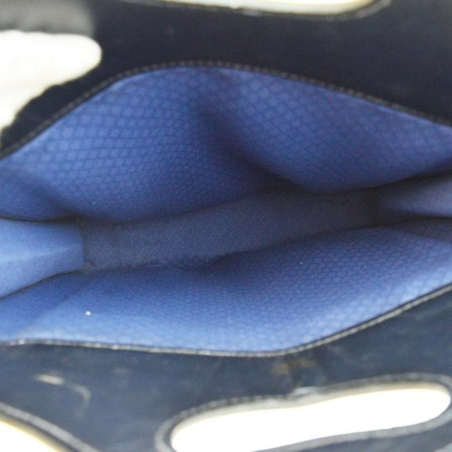 The interior is also in excellent overall condition. Inside, there is one main compartment and no pockets. The interior is lined with the diamond print fabric many Gucci purses of this era are in blue- see pictures. The fabric is very clean and shows no noticeable areas of wear and tear.