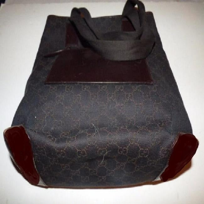 The bag is a two handle, tote or satchel style purse by GUCCI. It is made from brown canvas with the large Gucci, double 'G' logo and brown leather. It has a zip close top with two handles, brown leather, bottom corner, and an exterior and interior zip pocket. The interior is in excellent overall condition with a matching fabric lining that is very clean.