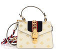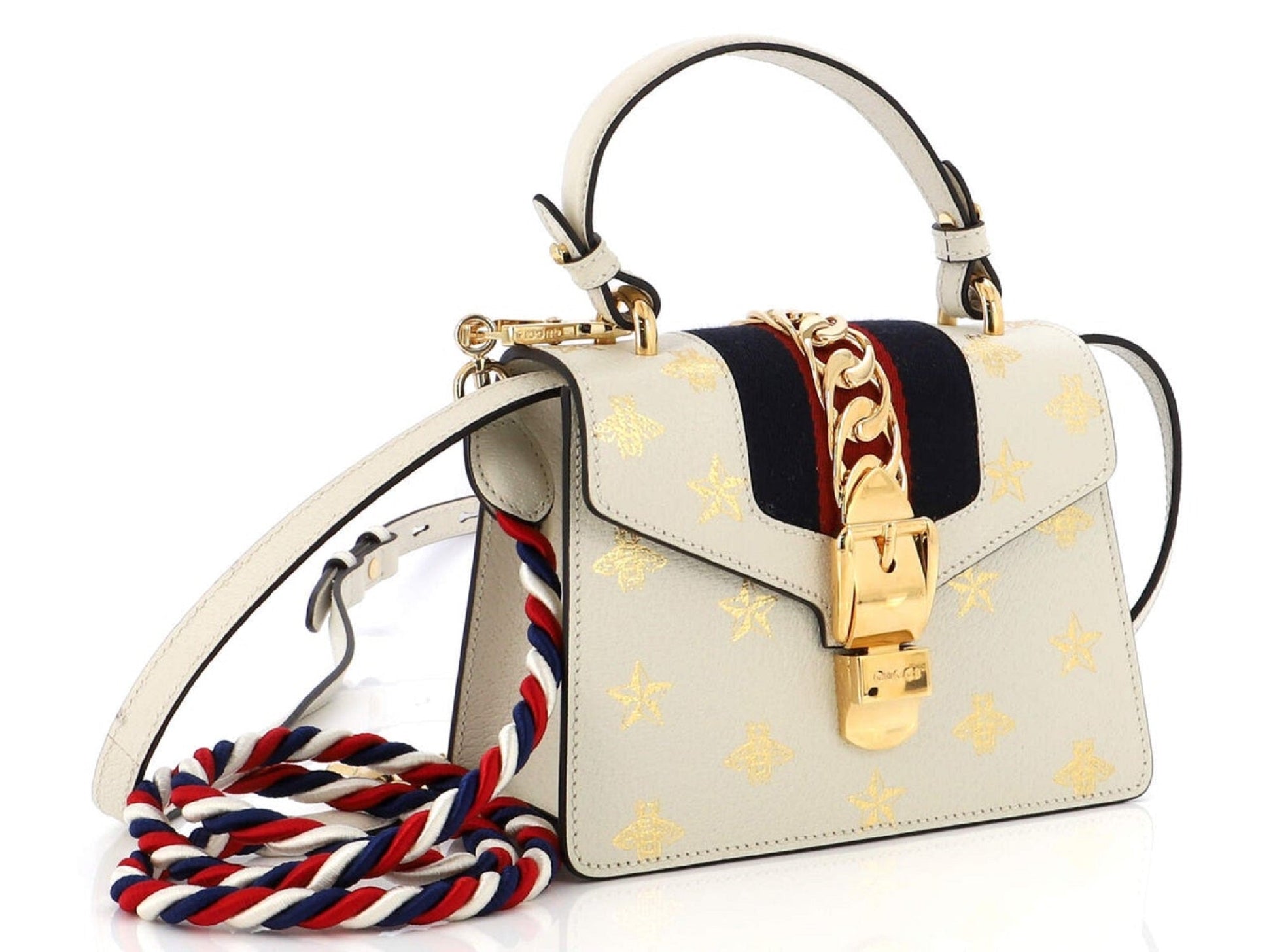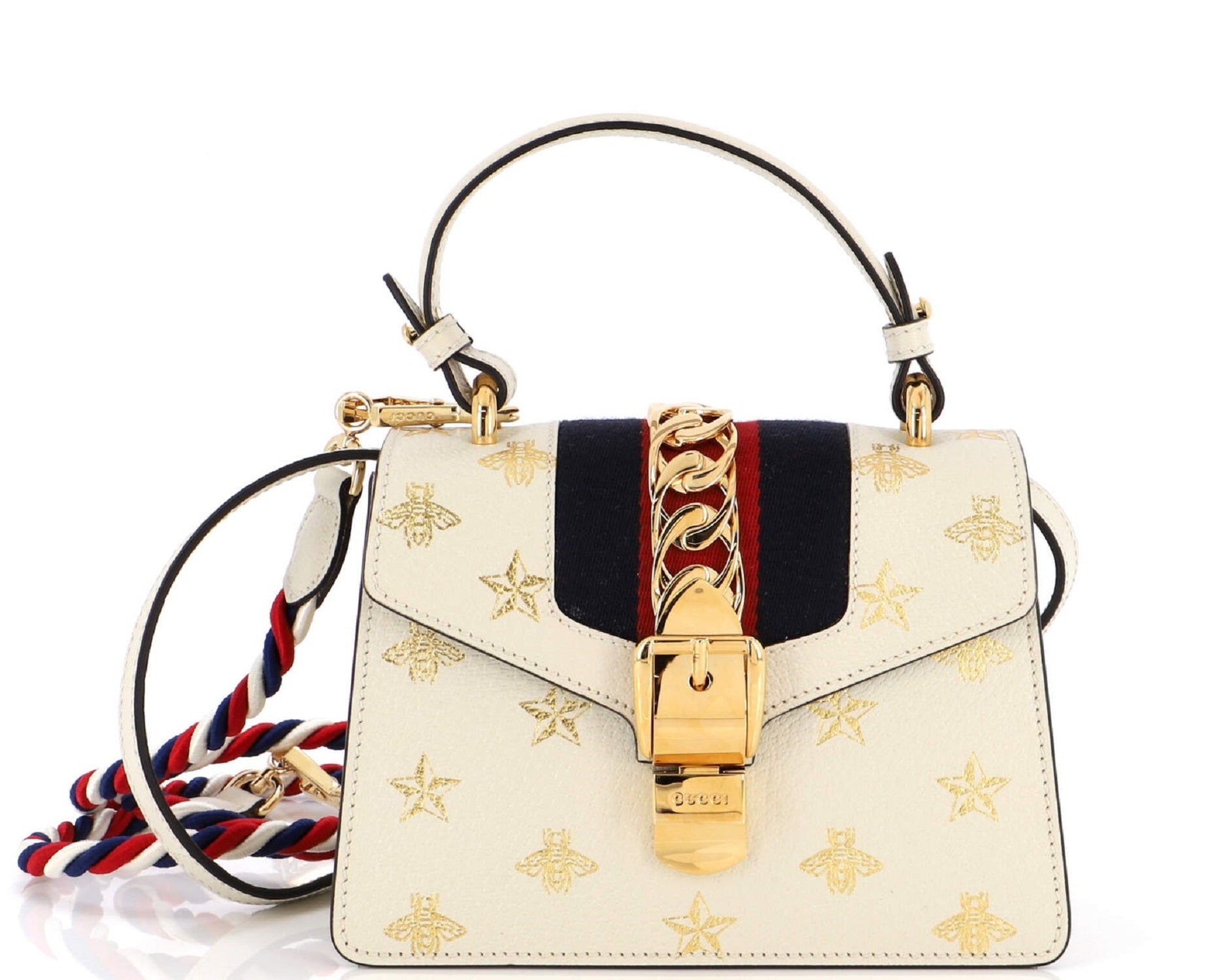 The Gucci Sylvie bag epitomizes luxury and sophistication. Crafted with meticulous attention to detail, this exquisite masterpiece seamlessly blends timeless elegance with a contemporary edge. This gorgeous Gucci Mini Sylvie Top Handle Bag features gold-stamped bees and stars, adorned with Gucci's signature web stripe and gold-tone metal chain, this bag exudes opulence at every angle. This mini can be sported as a top handle, with the matching white leather strap, or with a more festive red, white & blue twist rope strap.