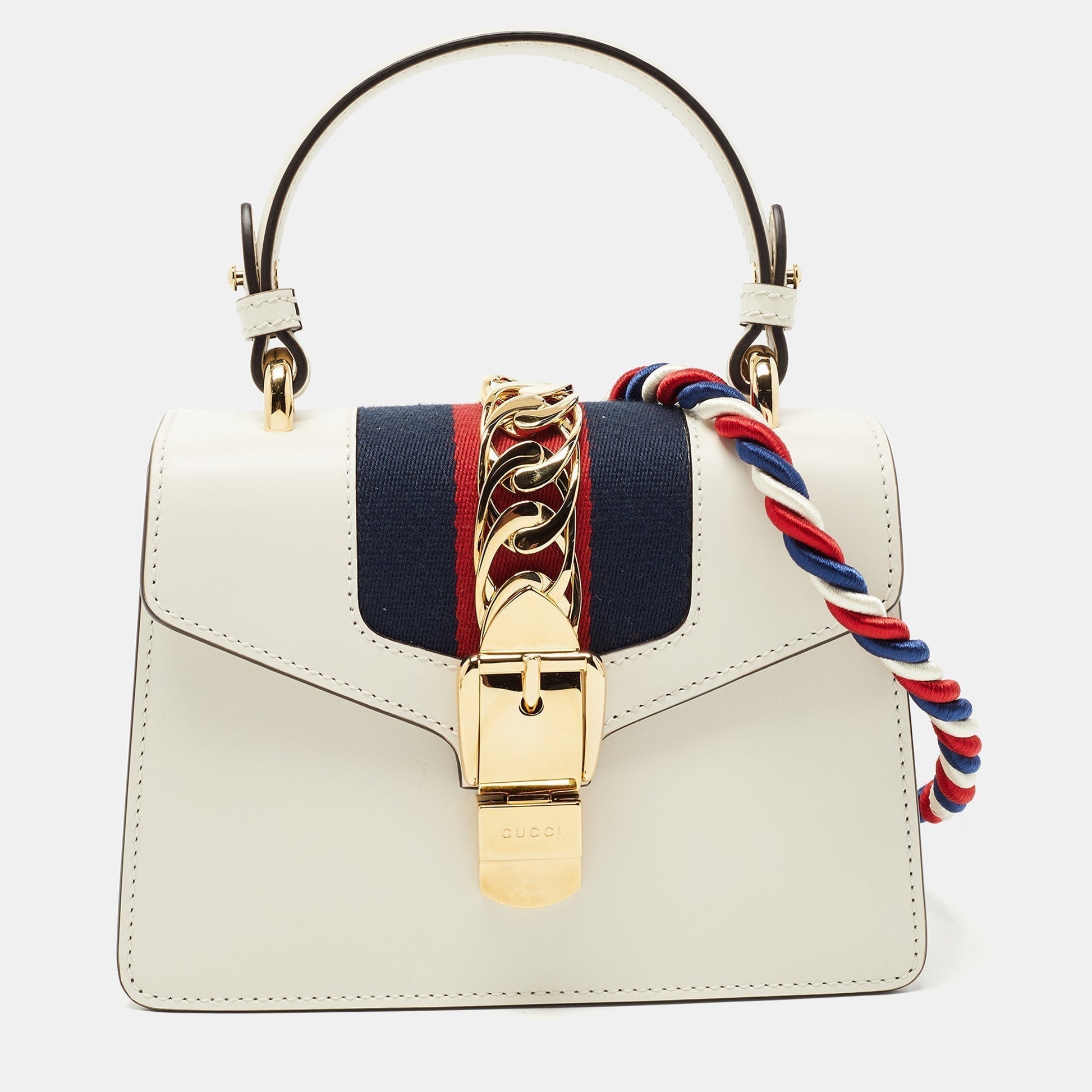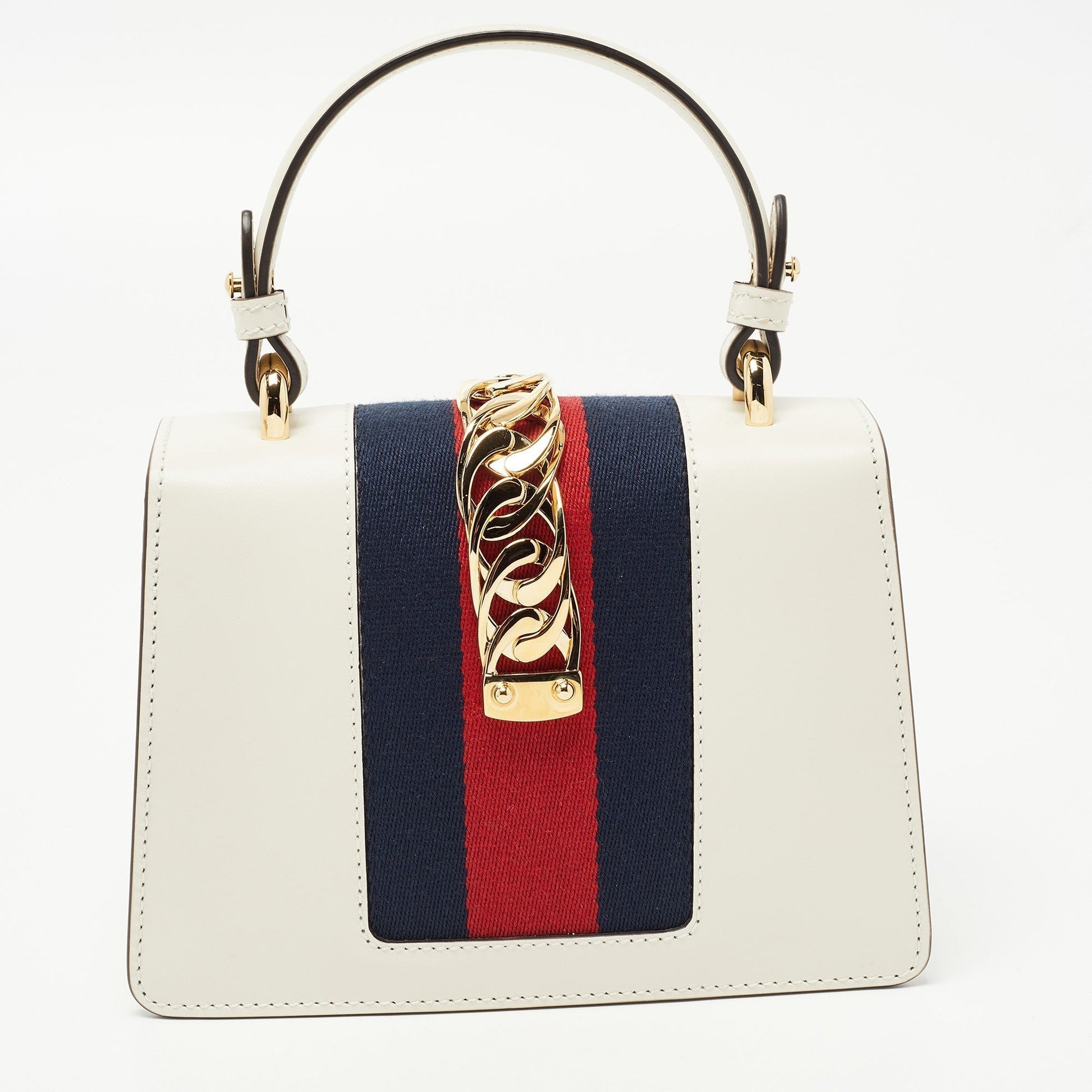 GUCCI White Leather Mini Web Sylvie Top Handle Bag