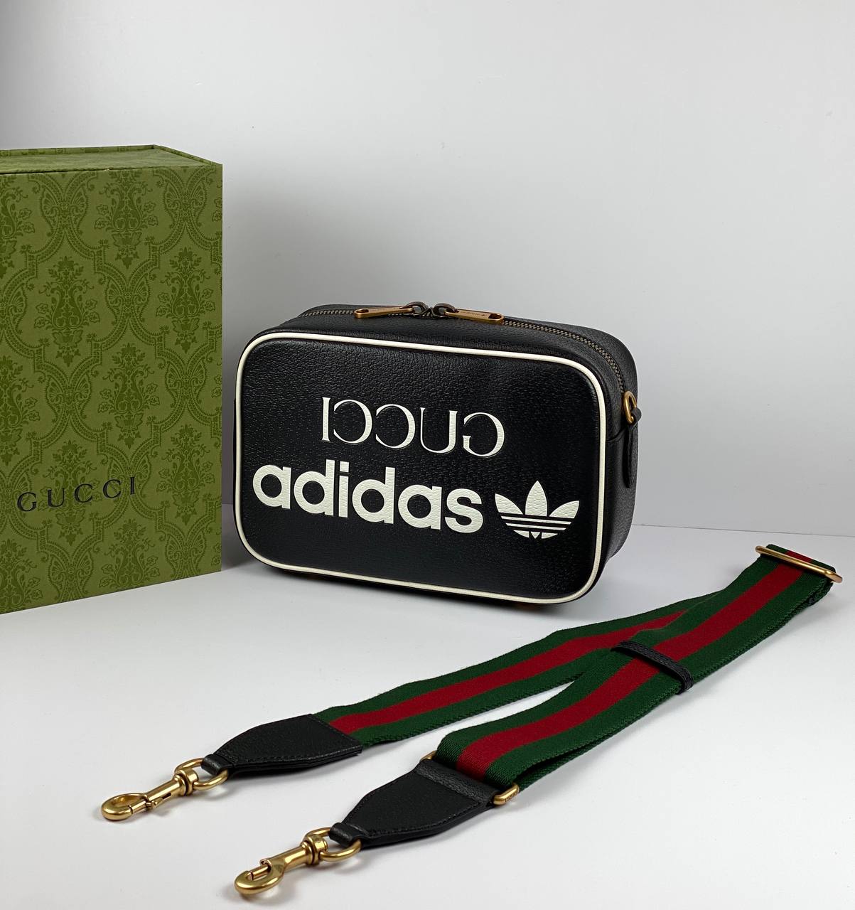 Part of the adidas x Gucci collection, this small shoulder bag features the 'Gucci adidas' and Trefoil print. adidas and Gucci venture into a collection, where the Web juxtaposes with the three white stripes, and the GG monogram combines with the trefoil. Pulling inspiration from the Creative Director�s memories of the '80s and '90s, emblematic House�s motifs mix with those of the historic sportswear brand adidas resulting in a series of hybrid looks.