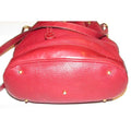 The bag is made a combination of red, pebbled and smooth leather in a bucket style, cross body or shoulder bag with lots of room! It has a drawstring top closure and an adjustable strap. The drawstring is connected and there is a gold engraved 'GG' accent that regulates how tight it is around the top. The purse has a footed bottom and gold engraved hardware. This is a fabulous purse has a lifetime to live with you!