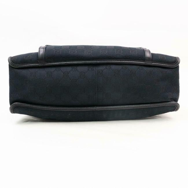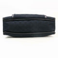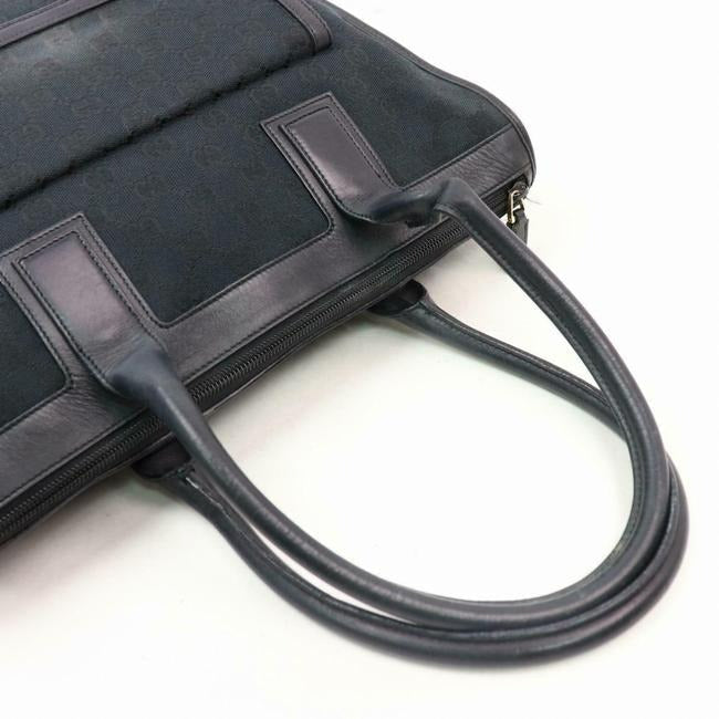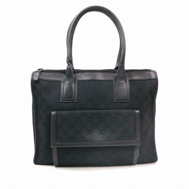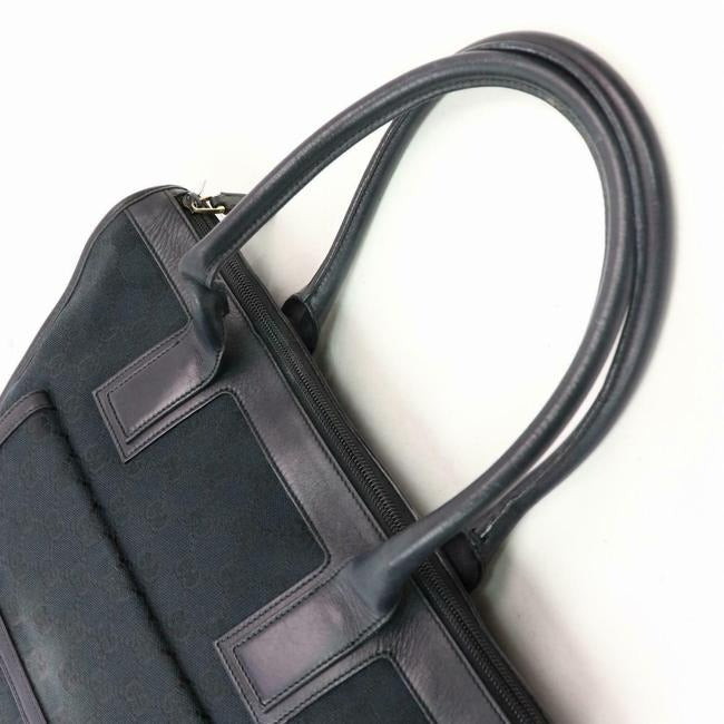 The bag is a two handle, tote or satchel style purse by GUCCI. It is made from heavy, black canvas with the large Gucci, G logo print and black leather. It has a zip top closure with two hard leather handles, thick black leather trim and top edges. There is an exterior, envelope close pocket that is attached to the bag. The interior is in excellent overall condition with a matching fabric lining that is very clean.