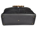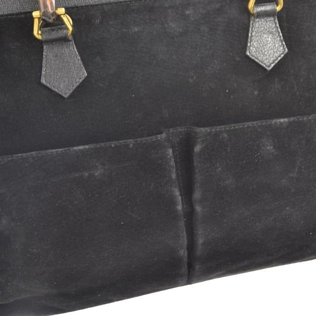 * For sale is a Gucci, mod look, black suede and leather, two-way: tote or satchel with two bamboo handles, a footed bottom, removable strap, and exterior pockets! It has the 1960's classic mod style Gucci is known for and would be great used as your signature black purse or laptop holder!