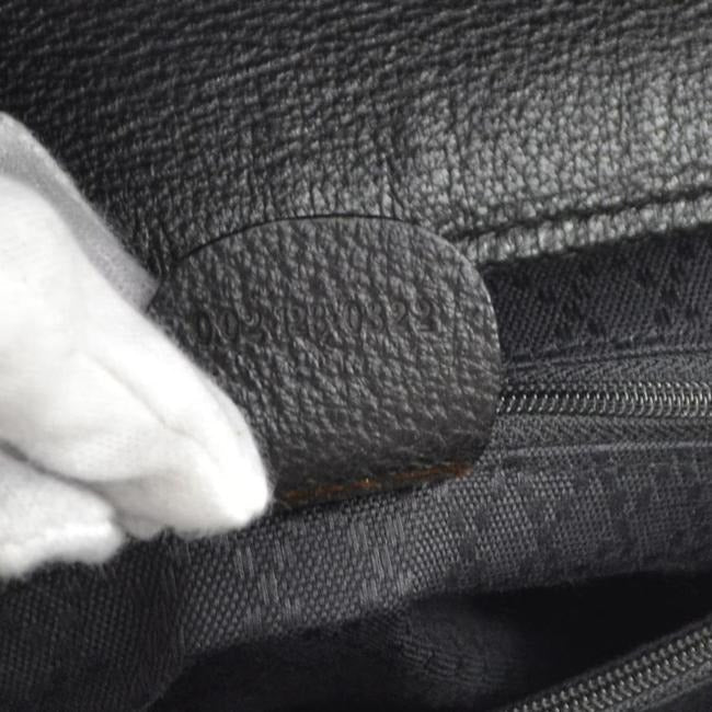 On the interior there is one large compartment with a back zipper pocket! It has a wide snap close strap on the top to keep everything secure. The lining is the newer fabric style in a black diamond print, Gucci often uses. It is very clean and in my opinion, it looks very lightly used! The purse has a serial number of 002.123.0322 (faded).